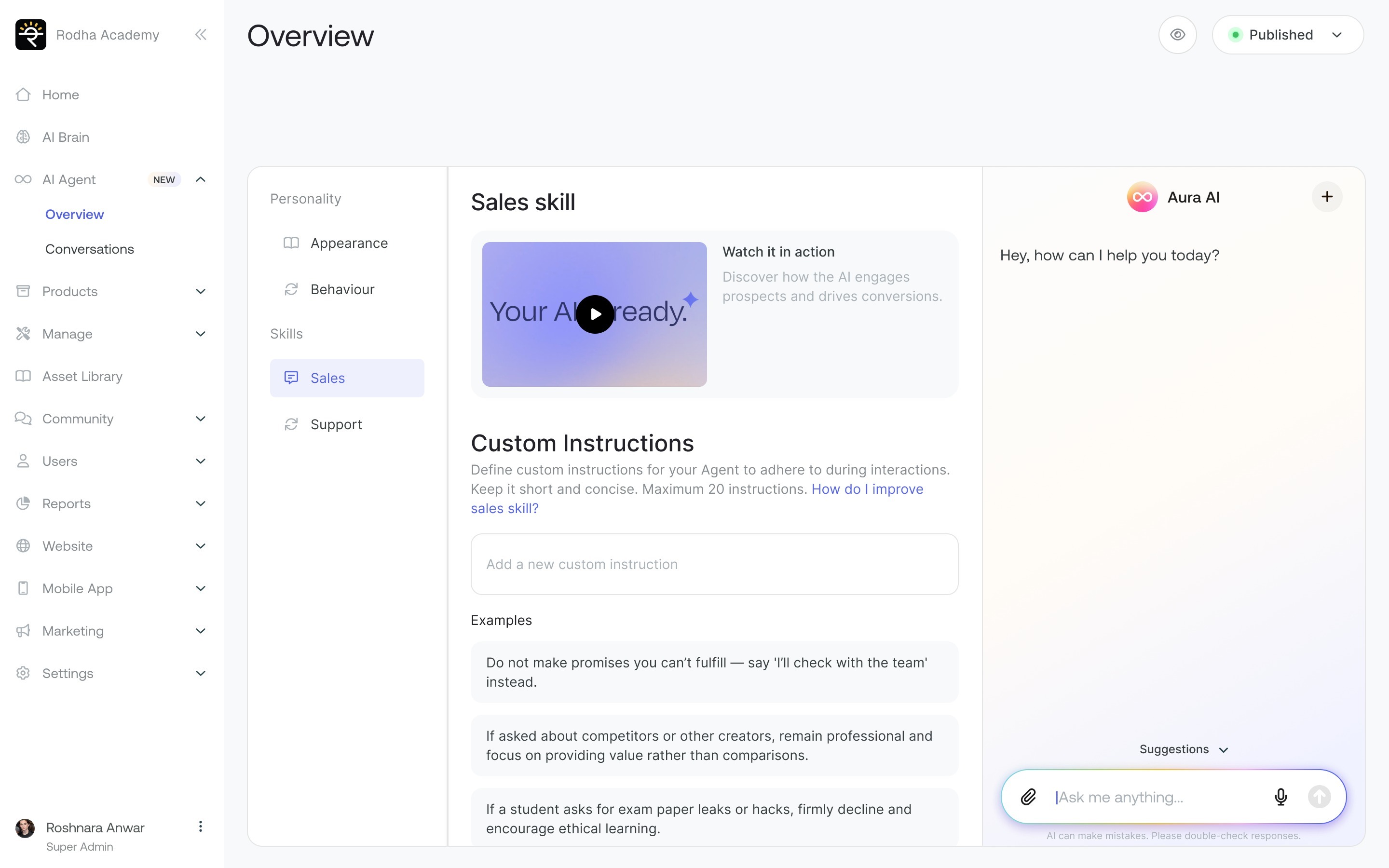 Your AI Agent's sales skills determine how effectively it can engage potential buyers, showcase your offerings, and guide them toward making a purchase decision. By customizing these skills, you can create a more persuasive and helpful Agent that aligns with your business style.