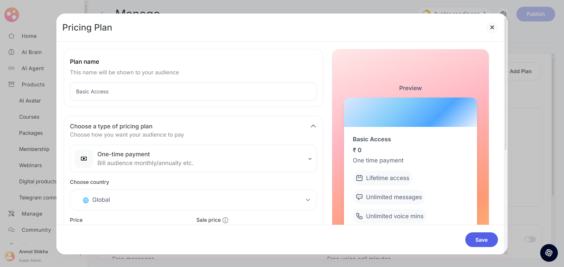 AI Avatar pricing allows you to create different payment plans for users who want to interact with your AI Avatar. You can set up Free or One-time, with different limits, features, and durations.