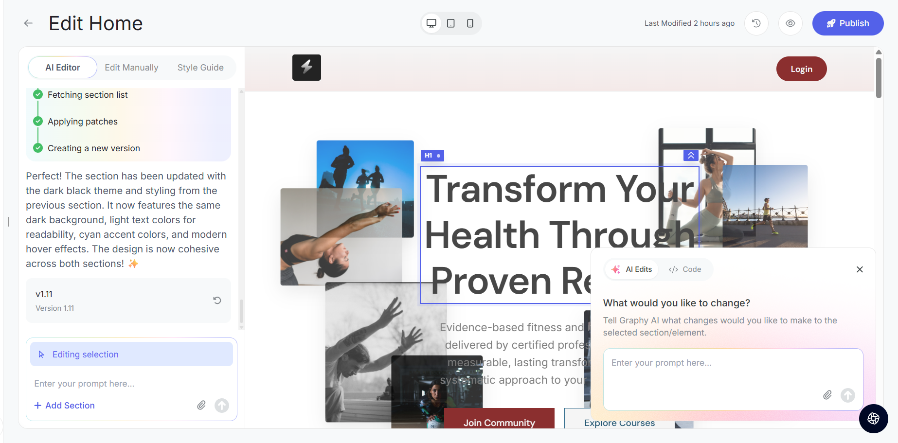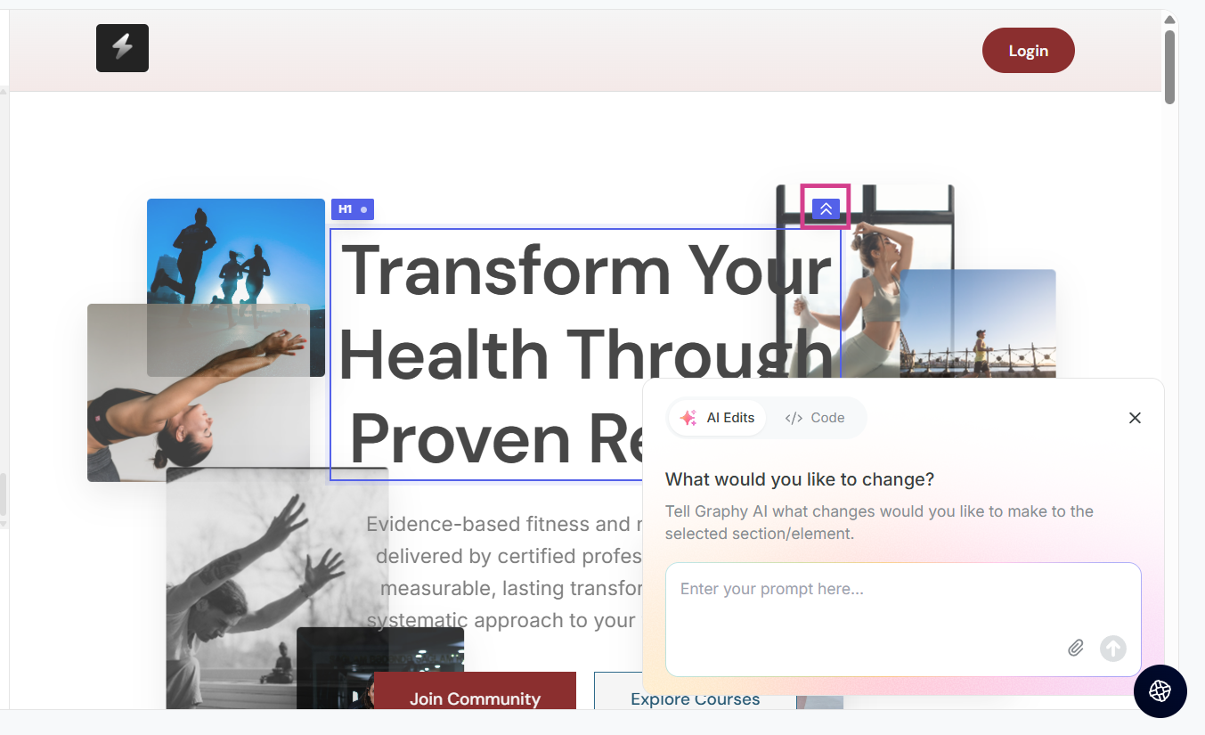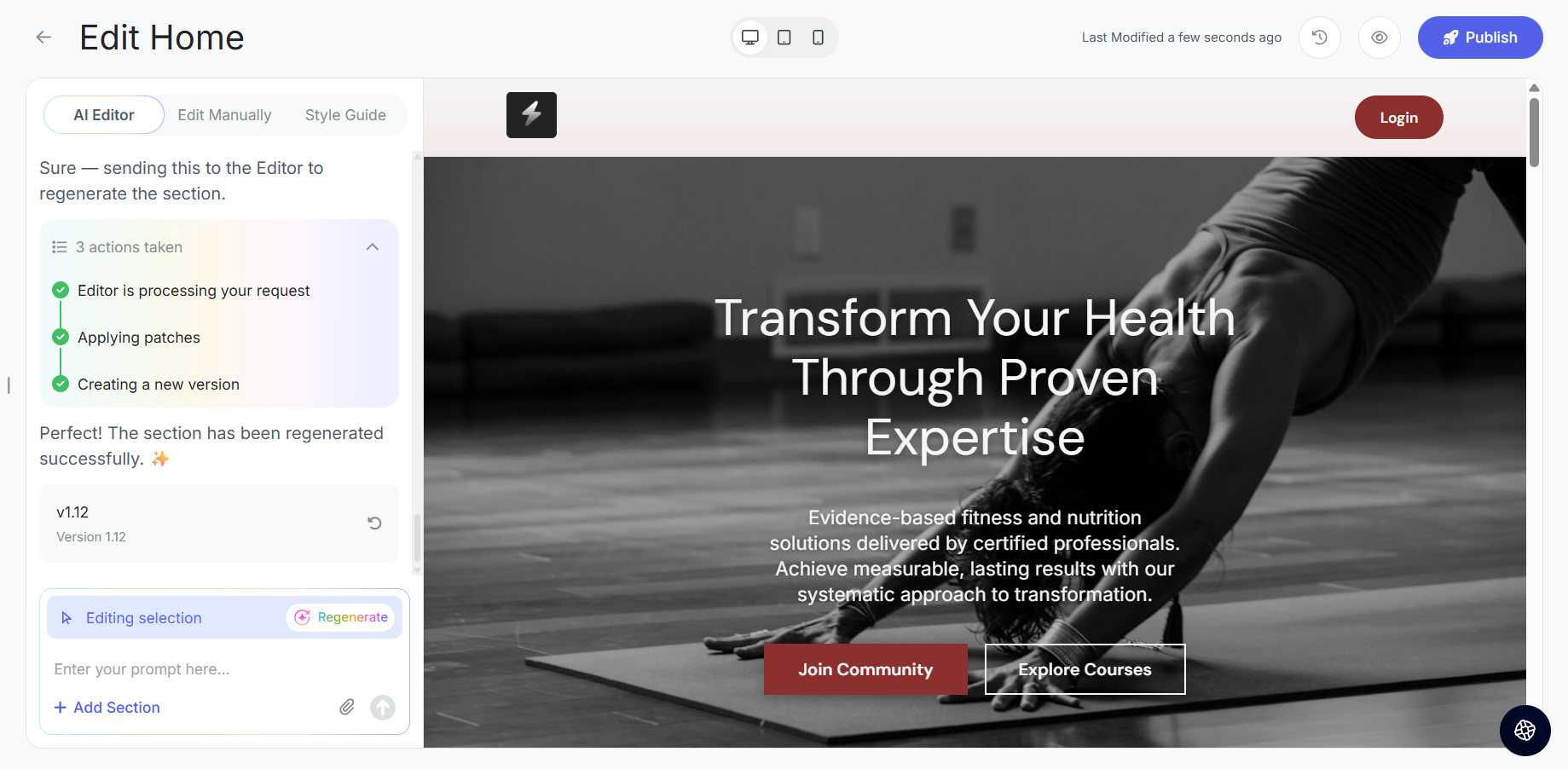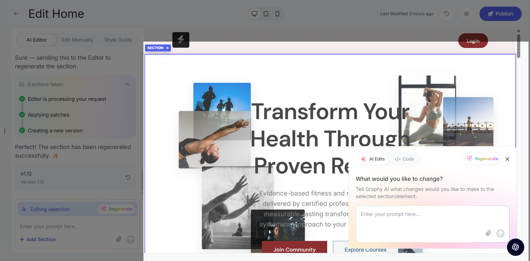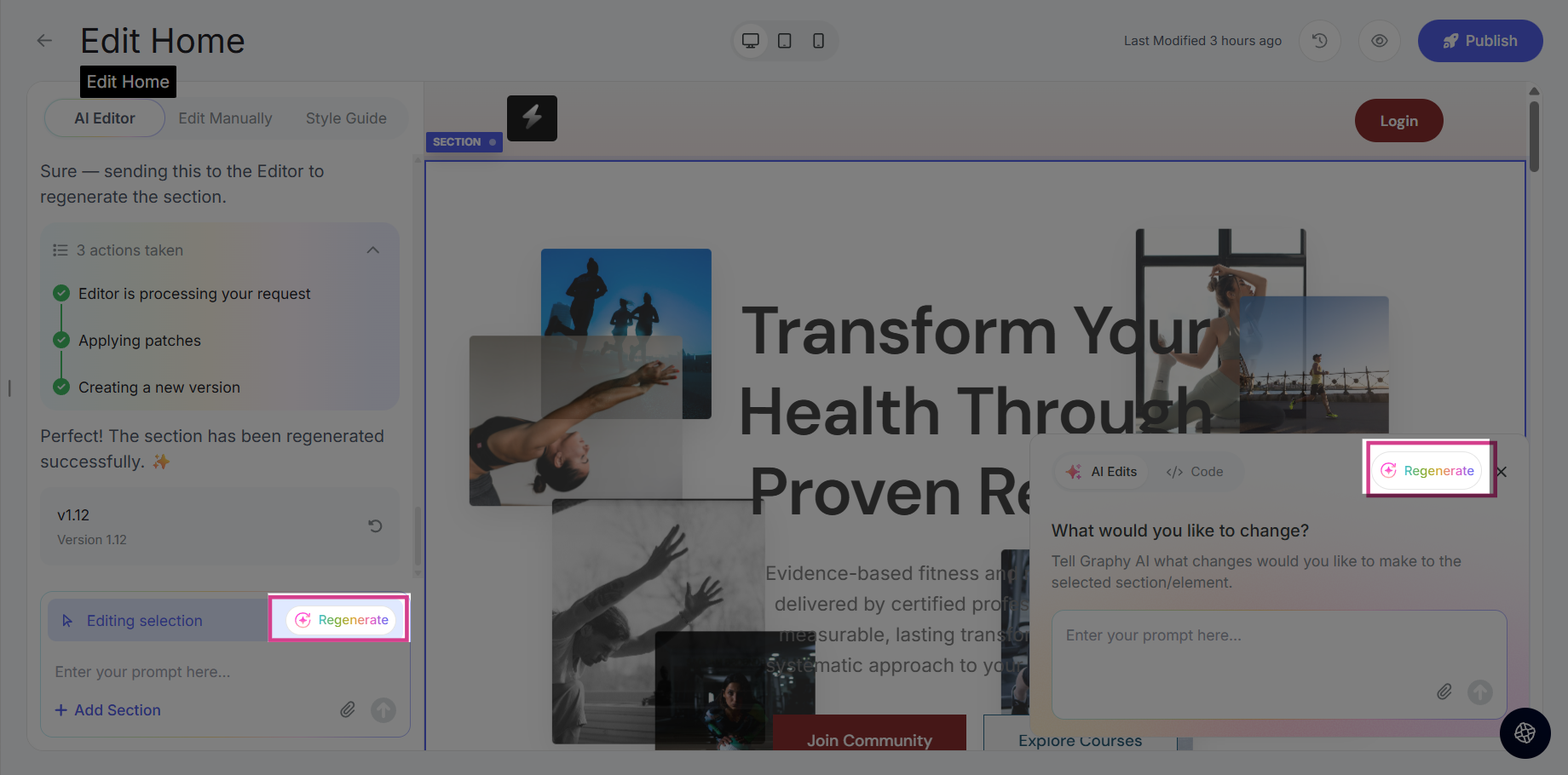 This article is a step-by-step guide on regenerating sections in your website pages using the AI Editor on Graphy.The Regenerate feature allows you to regenerate an entire section of your webpage with a single click. This is useful when you want to create a completely new version of a section.